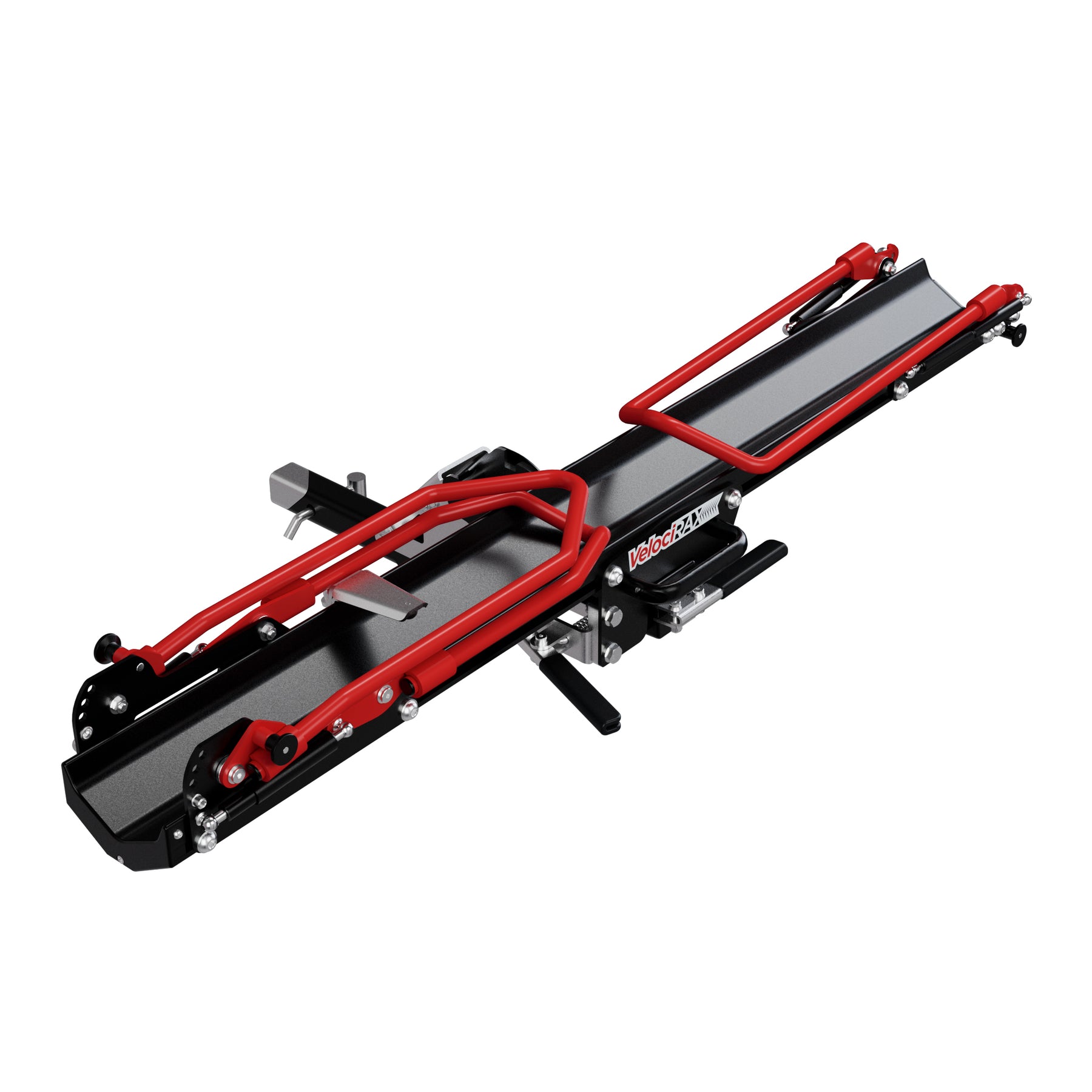 The RAXzilla is VelociRAX’s first platform bike rack built to make carrying heavy bikes effortless. Instead of lifting your bike onto the rack, simply roll it up the retractable ramp, push it forward, and the auto-clamping front tire system instantly secures the bike in place. There’s no need to balance the bike while securing the back tire—RAXzilla holds it for you. The result is a faster, easier experience that lets you load or unload your bike in under 10 seconds, even with heavy e-bikes or dirt bikes.